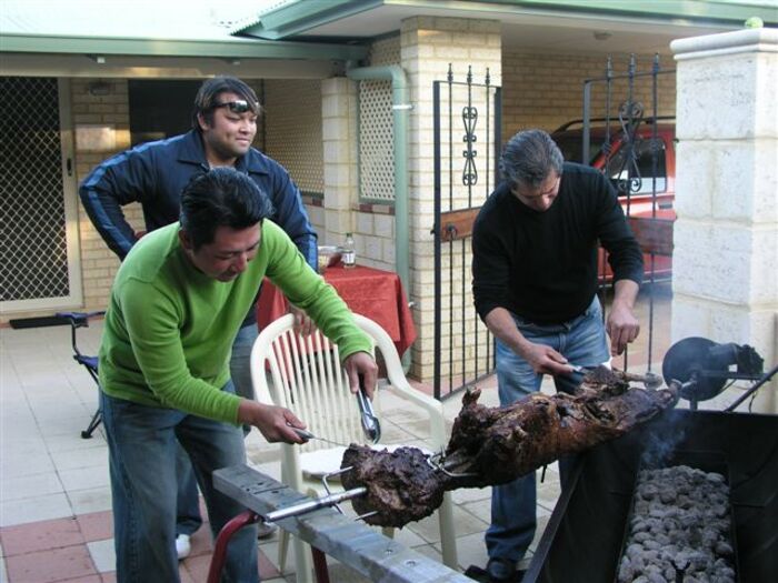 Celebratory BBQ after the Show at Allan's place. Charlie, Phong and Fats serving the meat!